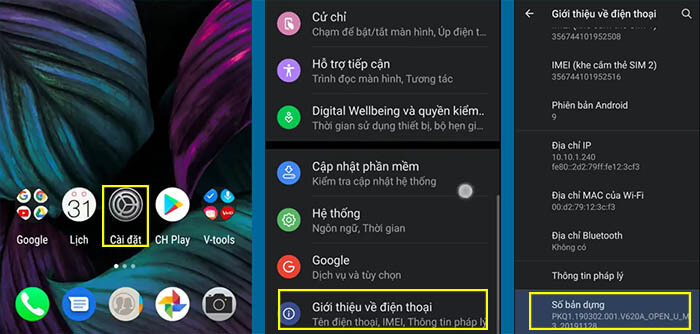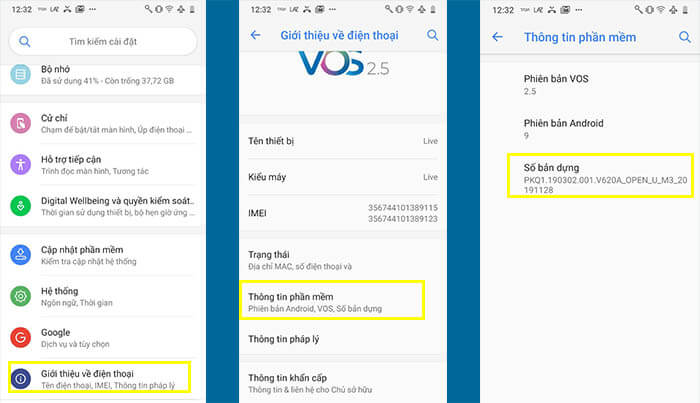 Với bạn nào đang sử dụng phiên bản VOS 2.0 thì bạn có thể vào theo trình tự các bác sau : Cài đặt -> Giới thiệu về điện thoại-> Số bản dựng như hình ảnh bên dưới đây.Với VOS 2.5