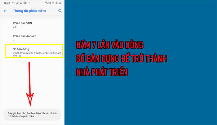 Ở bước tiếp theo bạn sẽ tiến hành bấm vào dòng Số bản dựng (Build Number) 7 lần liên tiếp, khi bấm liên tục bạn sẽ thấy điện thoại thông báo lên số lần bấm còn lại để trở thành nhà phát triển.Vsmart cũng khá giống với điện thoại Samsung khi bấm vào dòng Số bản dựng còn với Xiaomi thì lại bấm vào Phiên bản MIUI mới kích hoạt được.