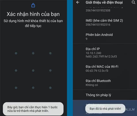 Sau khi bấm xong 7 lần vào dòng Số bản dựng thì lúc nào điện thoại Vsmart của bạn sẽ yêu cầu bạn nhập lại mật khẩu điện thoại một lần nữa để xác minh và sau khi nhập xong sẽ có thông báo lên rằng Bạn đã là nhà phát triển như vậy là bạn đã kích hoạt thành công chế độ này.